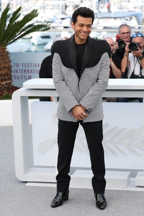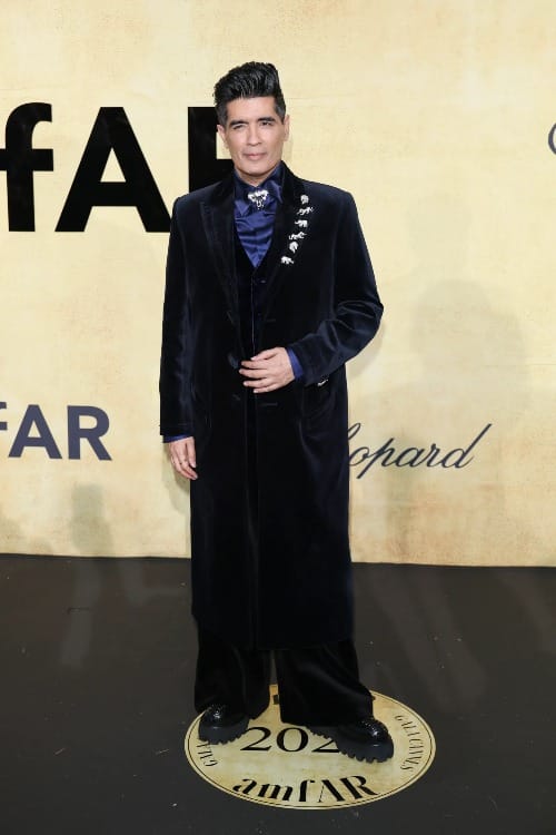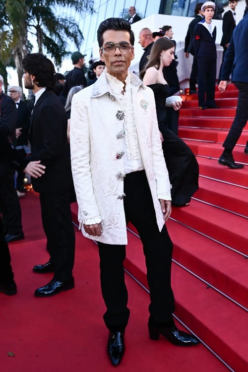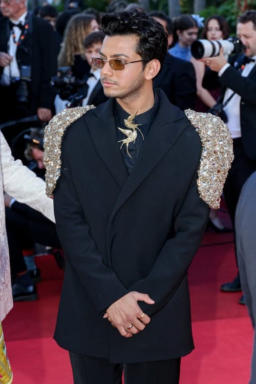 After a grand debut at the Met Gala, couturier Manish Malhotra made his Cannes entrance in a deep navy velvet suit, accessorized with brooches and elevated platform shoes. The designer’s signature touch was evident in the luxurious textures and standout accessories.
