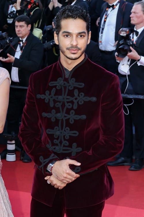 Ishaan channeled royal elegance in a maroon velvet bandhgala set by Gaurav Gupta, detailed with intricate zardozi work across the chest.