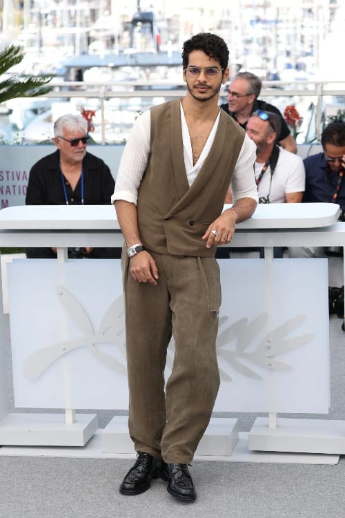 Vishal Jethwa, one of the stars of Homebound, wore a tailored black suit from Kaushik Velendra's Fall/Winter 2024 line. A gold brooch shaped like two birds and gold-accented shoulders added an extra layer of elegance.