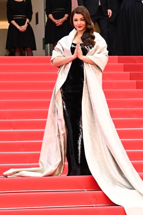 For her 22nd Cannes appearance, Aishwarya Rai Bachchan brought timeless grace in a custom Banarasi sari by Manish Malhotra. The white-and-gold weave, complemented by a striking ruby necklace and sindoor, paid homage to traditional Indian bridal aesthetics.