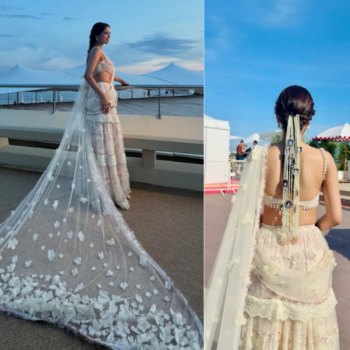 Alia Bhatt arrived later at the festival but certainly made her mark. Her first look featured an ethereal ivory-toned mermaid gown by Schiaparelli, adorned with delicate floral embroidery. She paired the dress with statement earrings from Birdhichand Ghanshyamdas.