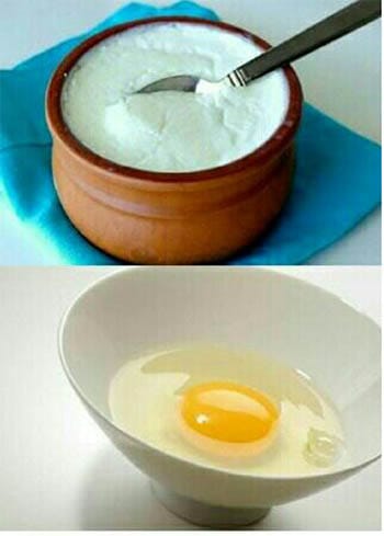 - In a bowl, mix the egg whites of two eggs with two tablespoons of fresh curd or yogurt.