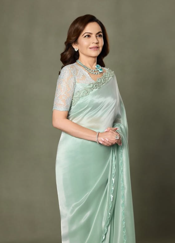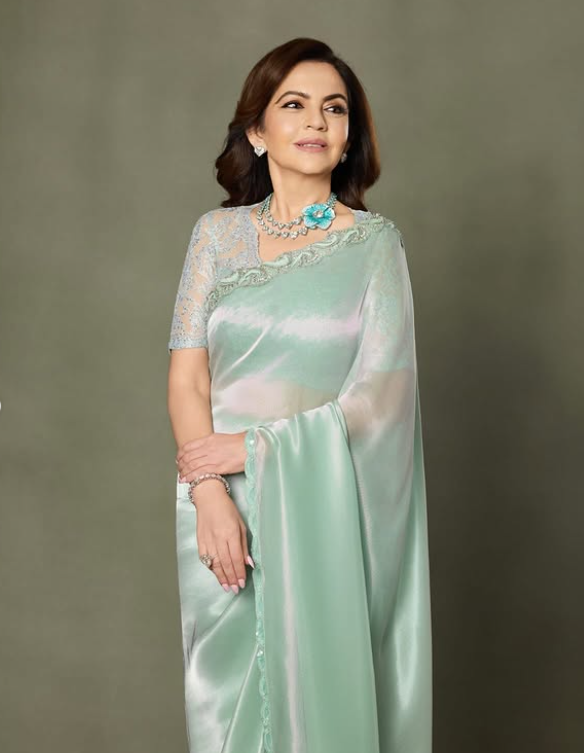 Nita Ambani made a striking appearance at the premiere of The Ba**ds of Bollywood*, turning heads in a jade-green lamé sari by Manish Malhotra. The shimmering drape, paired with a Swarovski-crystal embellished Chantilly lace blouse, beautifully balanced Indian craftsmanship with modern couture.