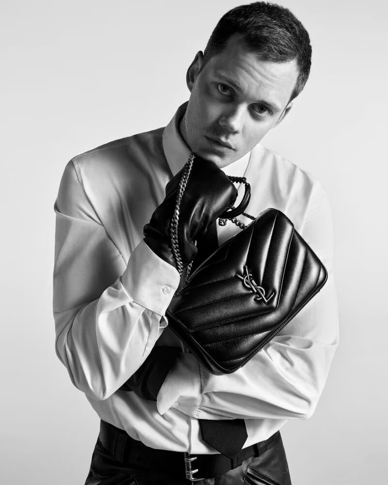 Each star brings a distinct energy to the visuals. Hailey Bieber channels a polished, minimalist look, dressed in sharply tailored leather pieces that feel both powerful and understated. Rosé continues her long-standing relationship with the brand, embodying Saint Laurent’s rock-inspired glamour with a softer touch that resonates with her global fan base. Newcomer to the Saint Laurent family, Bill Skarsgård, adds a cinematic weight to the lineup, broadening the campaign’s reach into menswear with his moody, magnetic presence.